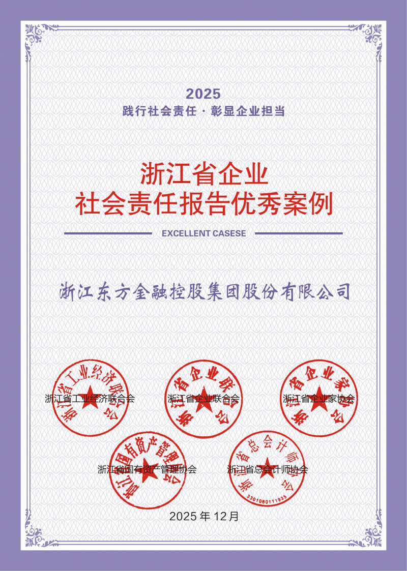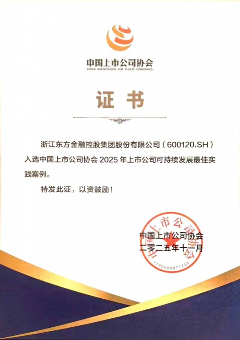 浙江東方再次榮獲“2025年上市公司可持續發展最佳實踐案例”“優秀上市公司獎”“最具社會責任上市公司獎”“2025浙江省企業社會責任報告優秀案例”等多項獎項。